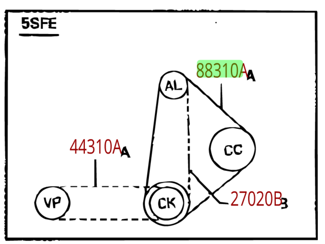4 cylinder. 2.2L. Japan Built. Routing:Crk,Comp,Alt. Compressor and Alternator. Vendor:bando.